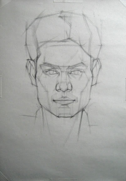*Sang đến bước thứ 3 các bạn dựa theo các khung mảng đã dựng bắt đầu thực hiện việc thể hiện đậm nhạt . Các bạn không nên lên bóng của từng chi tiết mà nên lên những diện lớn trước . Theo tôi tốt các bạn nên nối liền toàn bộ vùng bóng tối thành 1 tuyến lớn để tách hình thể thành 2 phần sáng và tối , ban đầu các bạn chỉ nên vẽ 2 sắc độ , khi tương quan lớn đã xong chúng ta mới thêm đậm bằng cách trồng thêm các lớp chì theo hướng của khối ( khối nghiêng thế nào thì nét nghiêng theo hướng đó ) . Công đoạn này các bạn luôn phải vẽ trong trạng thái nheo mắt hoặc vẽ được một phần các bạn nên lùi ra xa để xem tương quan , điều này là cần thiết vì nó sẽ giúp bạn sẽ tự đánh giá bài vẽ một cách khách quan .Các bạn cứ vẽ thô đừng vội chau chuốt hình thể & nên hạn chế dùng tẩy ,chỉ những phần nào sai một cách quá đáng thì mới tẩy bớt đi vì nếu có cục tẩy kè kè bên cạnh các bạn sẽ không thể mạnh dạn vẽ được .